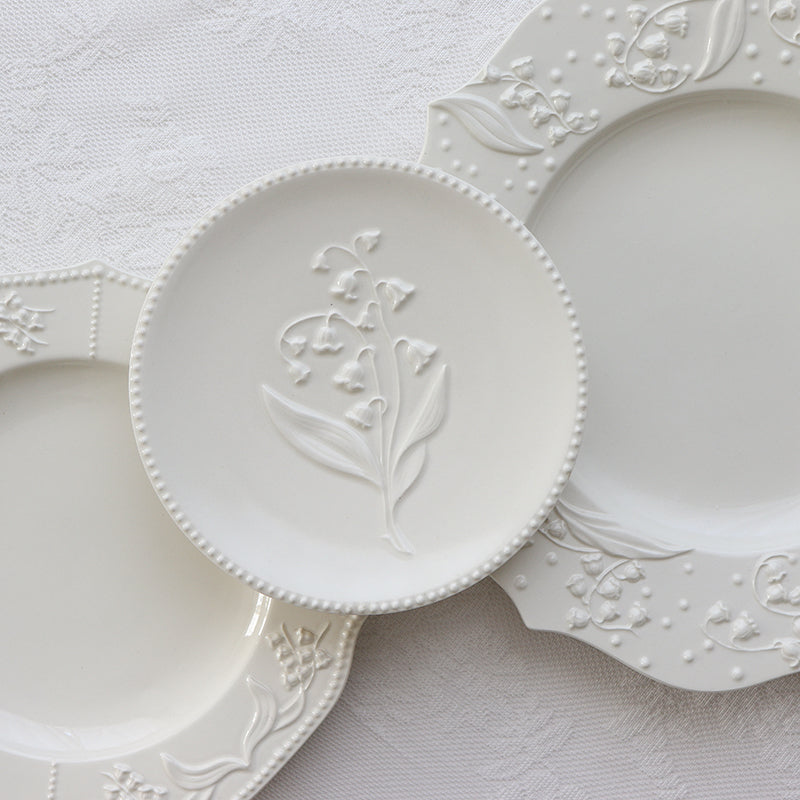 Introduce a touch of understated luxury to your table with our American Embossed Ceramic Plate, featuring a Lily of The Valley Flower Relief Lace design. This piece blends vintage charm with a chic, modern European aesthetic, making it a timeless addition to your tableware collection.